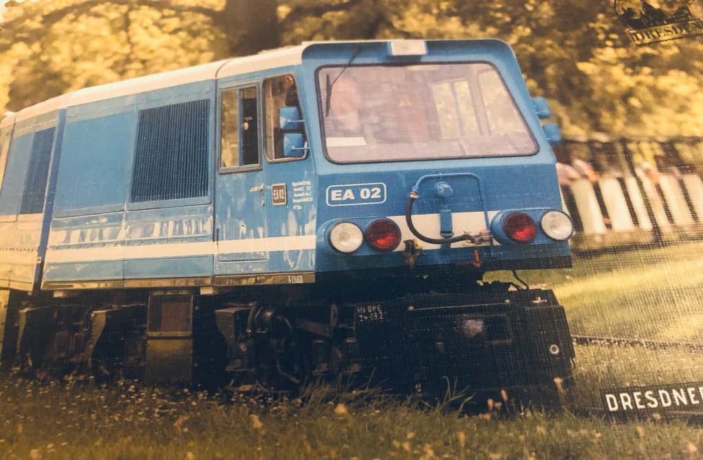 Das nächste Zeitloch kündigte sich mit einem schrillen Pfiff an: Gegenüber der Fabrik ist der Bahnhof der Parkeisenbahn (ehem. Pioniereisenbahn), einer Miniaturbahn, die nur von Kindern betrieben wird. Das wäre doch eine schöne Aufmunterung für die Kinder, nach der grusligen Fabrik. Schon fuhr der Zug ein. Aber zwischen uns und dem Bahnhof war ein Hecke. Mein Jüngster war schlau und lief um die Hecke herum, der Ältere blieb stehen, während ich mich durch die Hecke auf den Bahnsteig zwängte. Vor mir stand plötzlich ein Kind in einer Reichsbahneruniform, eine Kelle in der Hand und sagte mit allem Ernst seines Amtes: „Das dürfen sie nicht!“ Sofort war ich umringt von jungen Menschen mit Schaffnermützen und wurde in bestem Amtsdeutsch auf meine Verfehlung hingewiesen. Mittlerweile hatte sich mein Jüngster in den wartenden Zug gesetzt. Ein Pfiff, und der Zug fuhr los. Ohne mir weiter Beachtung zu schenken, diskutierte die Gruppe nun darüber, wie mit dieser Situation umzugehen sei. Ich wurde zur Klärung des Sachverhalts in das Bahnhofsvorsteherbüro mitgenommen. Dort wurde mir nach kurzem Warten mitgeteilt, wie in der Sache verfahren würde: Die Person ohne Fahrschein würde am nächsten Bahnhof den Zug verlassen müssen. Der dortige Verantwortliche wäre bereits informiert. Ich wurde aufgefordert, einen Fahrschein für mich und meine Kinder zu lösen und meinen Sohn dort abzuholen. Der nächste Zug käme in einer Viertelstunde. Und das Seltsame: Trotz dieser amtlichen Gängelung fasste ich tiefes Vertrauen in diese Kindertruppe und ihre Betreuer. Ich hatte keine Zweifel, dass das auch klappen würde. Der Amtsjargon, die Trillerpfeifen und die komplette Ignorierung meiner Befürchtungen weckte die Erinnerung an die Reichs- und Bundesbahn der 1980er Jahre. Es war schrecklich, aber es funktionierte. Nach einer Viertelstunde kam tatsächlich der nächste Zug mit einer blauen E-Lok, die aussah als sei sie eine Requisite für das Ost-Sandmännchen. Wir wurden angewiesen, im letzten Wagen Platz zu nehmen. Dorthin würde mein Sohn dann an der nächsten Station gebracht. Und so geschah es dann auch. Ein erwachsener Bahner übergab ihn uns an der Station „Zoo“ mit einem wissenden Lächeln und wollte noch nicht einmal meinen Familienfahrausweis (18 Euro) sehen. Mein Sohn erzählte, dass er in das Bahnhofsvorsteherbüro gebracht wurde und der Vorsteher dort mit einem „komischen Telefon mit Schnur“ angerufen hätte. Wir hatten noch eine schöne, unerwartete Reise bei blauem Himmel und Sonnenschein. Die Menschen im großen Garten winkten und zu, wir winkten zurück und wir waren für eine Stunde in der DDR der 1980er Jahre.
