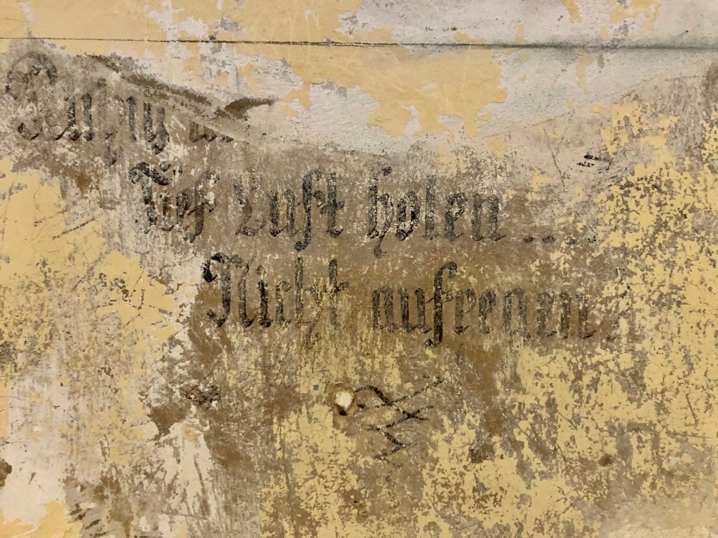 Ruhig bleiben Tief Luft holen Nicht aufregen (freigelegte Beschriftung in unserem Seminarraum für gewaltfreie Kommunikation)