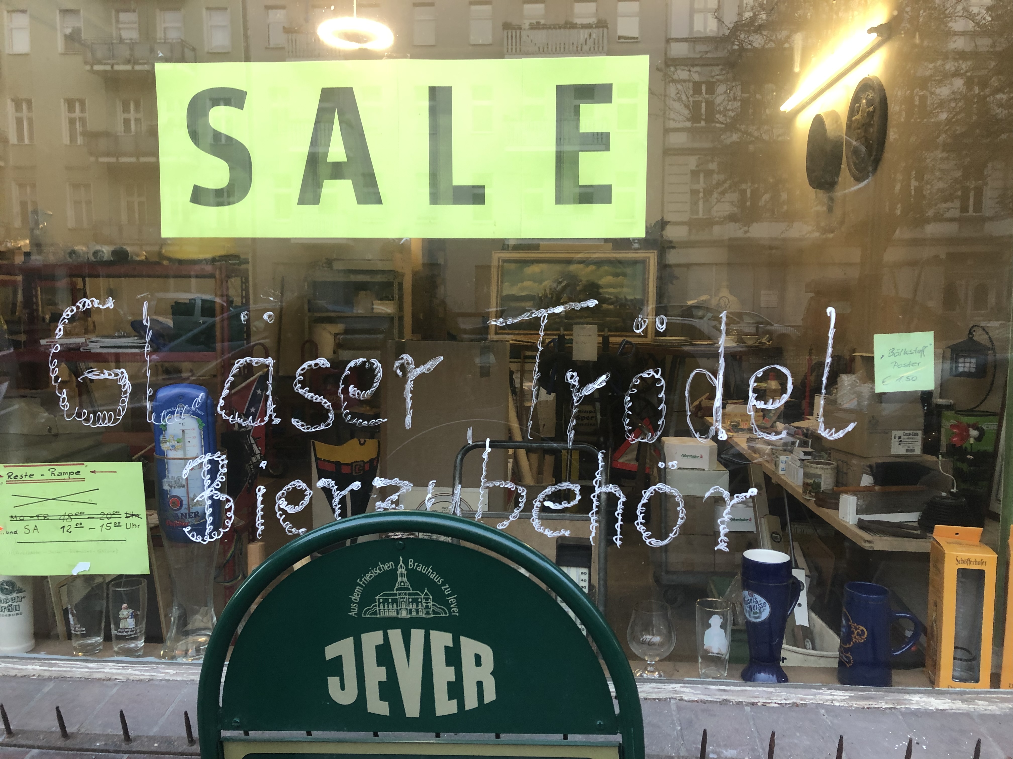 „Die Leute wollen auch die Preise für gute alte Sachen nicht mehr zahlen.“, brummt der robuste Händler mit den langen blonden Haaren, dem man ansieht, dass er lieber Schränke schleppt als um Preise zu feilschen. Er deutet auf ein hochwertiges Service aus den 60er-Jahren, das 60 Euro kosten soll. „Das ist viel mehr wert, das ist etwas Seltenes, was für Sammler. Aber hier im Wedding zahlt das keiner mehr. Die Leute haben ja auch immer weniger Geld.“ Solche Antiquitäten über das Internet zu verkaufen, habe er auch schon versucht. Aber das habe zu viel Ärger gebracht. Deshalb sei er zum alten „Anschauen, bezahlen, mitnehmen!“ zurückgekehrt. Aber so läuft das Geschäft heute nicht mehr. Deshalb ist bei Sephan jetzt Schluss. Ab Ende des Monats ist der Laden zu.