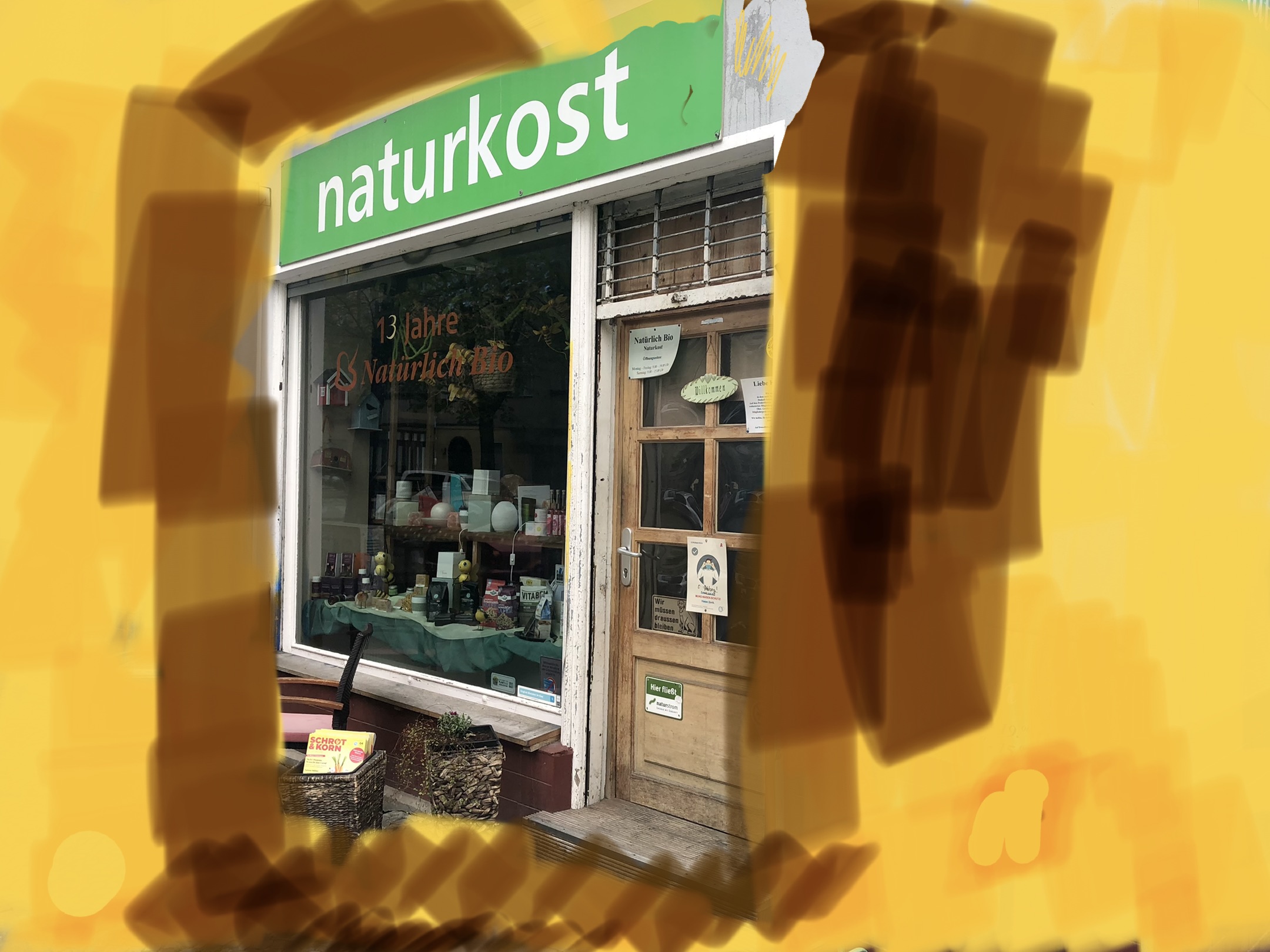 Als ich in meinen letzten Beitrag über einen grauen Herbsttag in Berlin ein Bild von einem heruntergekommenen Kiosk an einem grauen Herbsttag einfügen wollte, merkte ich: das geht nicht mehr. Seit Jahren fotografiere ich heruntergekommene Betonklötze, Geschäfte und Häuser in meinem Viertel. Alles Grau in Grau. Ich konnt‘s nicht mehr ertragen. Deshalb malte ich auf meinem Tablet ein paar bunte Linien um das graue Bild. So gefiel es mir schon besser. Ermutigt durch die freundlichen Rückmeldungen von docvogel und Susanne Haun malte ich einfach weiter in meiner Fotomediathek herum. Und es war wunderbar zu sehen, wie das graue Drumherum verschwand. Bunt ist es geworden und es ist noch genug Grau übriggeblieben. Ich hoffe, die Bilder machen euch so viel Spaß wie mir.