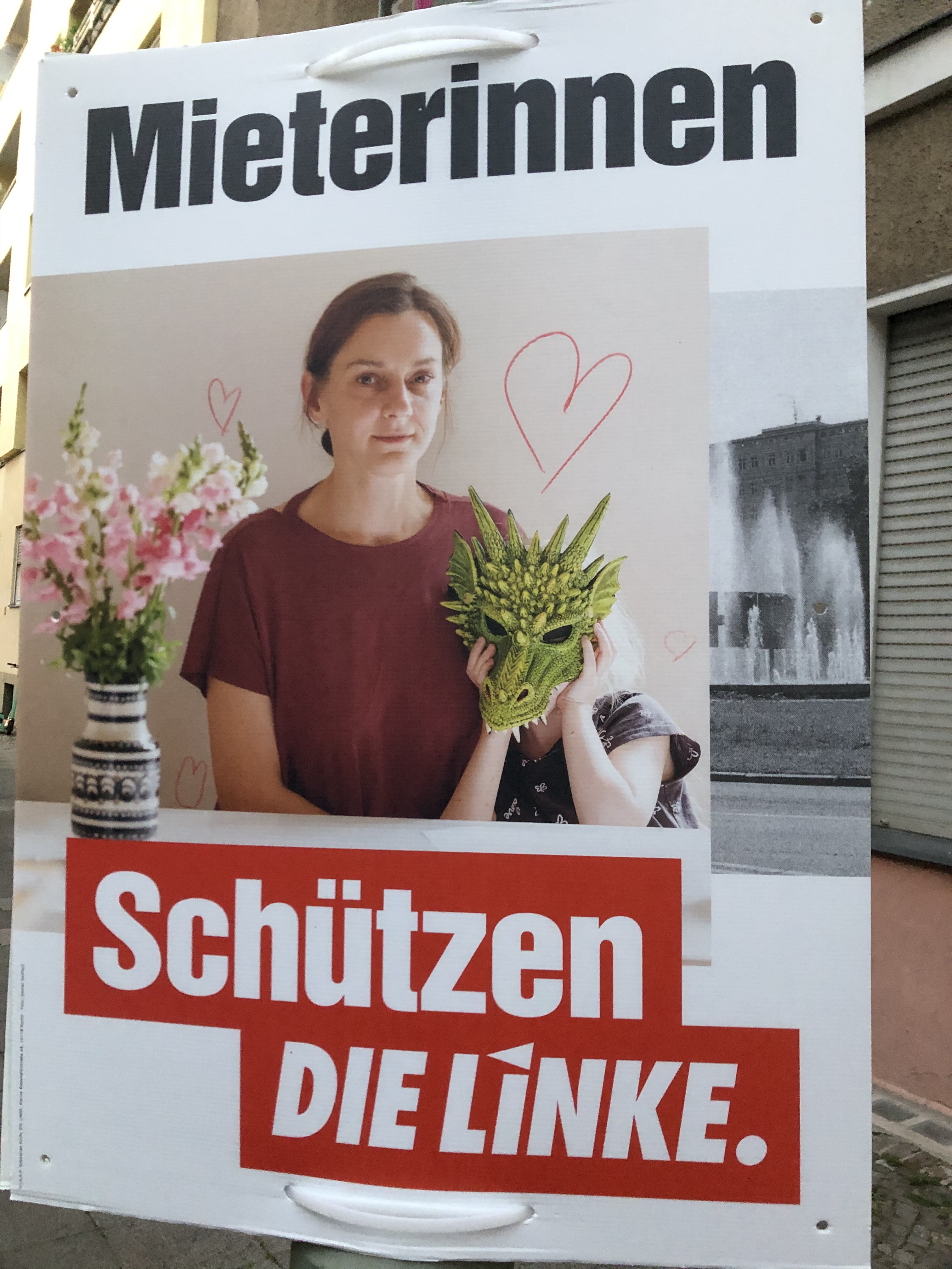 Und heute? Heute sollen die Mieterinnen das schützen, was von der Partei, die sich jetzt die Linke nennt, noch übrig geblieben ist? Ist das ihr Ernst? Natürlich steht bei der Mieterin noch ein bunter Blumenstrauß (vom letzten Frauentag, der dank der Partei in Berlin jetzt wieder Feiertag ist) auf dem Tisch. Aber soll wirklich diese, trotz ihres schweren Lebens tapfer lächelnde Alleinerziehende allein die Partei Die Linke schützen? Nein, nicht ganz allein. Sie hat ja noch den kleinen grünen Drachen. Der wird‘s richten.