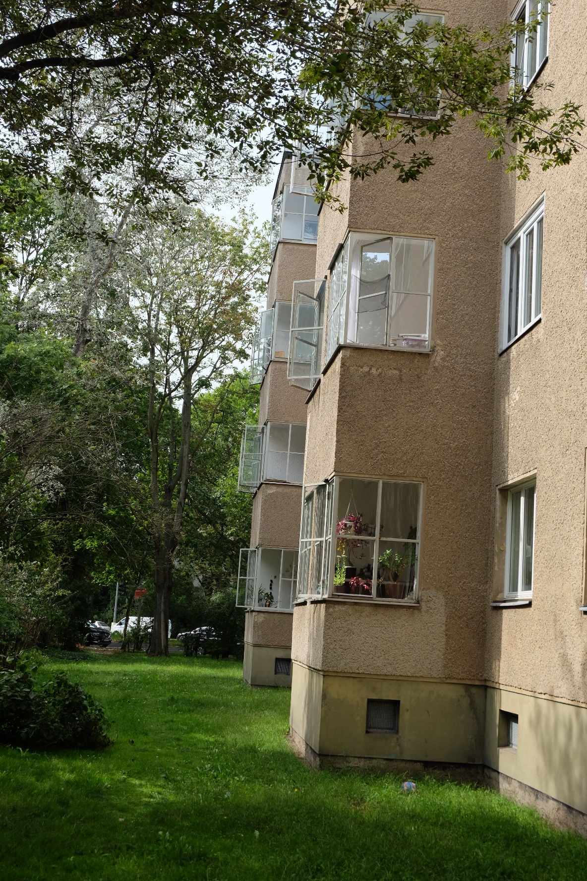 Bleibt zu hoffen, dass der Dornröschenschlaf, in dem große Teile der Siedlung liegen, nicht zum schleichenden Verfall wird. „An den Häusern selber ist lange nichts gemacht worden“, klagt Herr J. Der 50-Jährige stammt aus Slowenien und ich treffe ihn, als er auf einer der halbrunden Metallflächen sitzt, die hier jeden Eingang zieren. Sieben Jahre wohnte er hier. „Schauen sie sich die Metallfenster an! Das sind immer noch die alten.“ Und der Garten sei verwahrlost, beschwert er sich. „Aber wenn was kaputt ist, braucht man nur anzurufen, dann kommen sie schnell“, räumt er ein, ohne sich zu erinnern, wer eigentlich sein Vermieter war. Weggezogen – ins Märkische – ist er dann auch nicht wegen der Baumängel, sondern weil es mit der Liebe aus war. Heute ist er wieder da, um seine Ex-Freundin zu besuchen, die in der alten Wohnung geblieben ist. Liebe vergeht, Miete besteht.