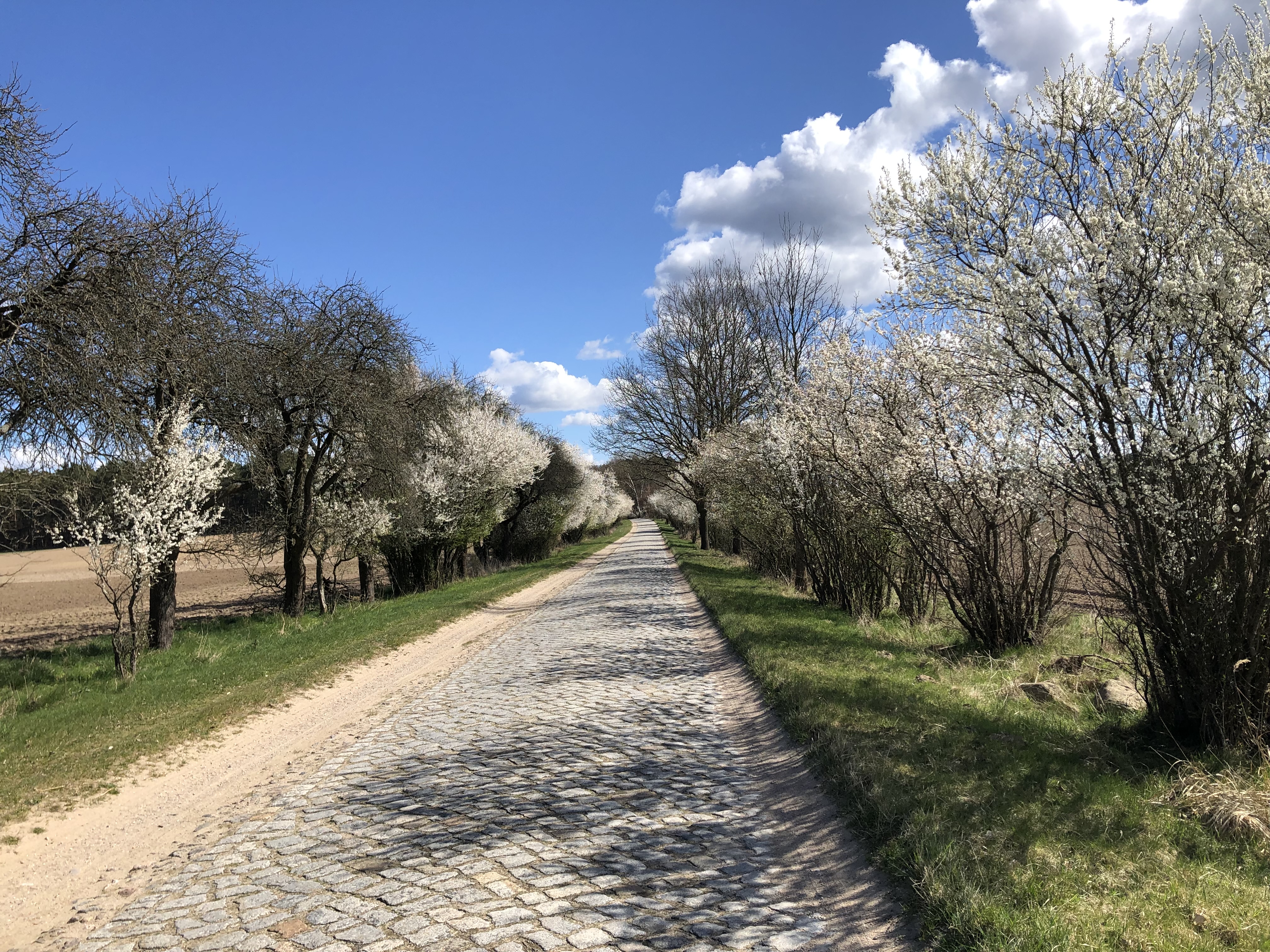 Sechster Tag: Ich fang jetzt nicht an mit: „Überirdisch schöner Tag!“, oder so. Aber es war schon besonders. Bei vielen in der Gruppe merkte man heute entspannte Gesichter und Theo, mit dem ich gestern auf der Terrasse saß und der mir sein Leben erzählt hatte, meinte, der Tag sei zu schön, um heute mit dem Auto in die Sauna zu fahren. Tatsächlich war alles ganz strahlend hell und der Himmel blitzeblau und die Luft mild. Wir waren beide mit dem Rad angereist. 10 km waren es bis zur Sauna in der alten Mühle, flache Strecke, das konnte ja nicht die Welt sein. Aber unsere Muskeln kriegten keinen Schwung, keine Kraft mehr und der Mund war trocken. Es war eine Quälerei. Und blöderweise kamen mir bei der Schinderei die KZ-Häftlinge in Ravensbrück in den Kopf, die auch ohne was im Bauch Schwerstarbeit leisten mussten. Dieses Gefühl der Schwäche allein ist schon entwürdigend, das kann ich jetzt nachvollziehen. Da braucht es keine Schikane durch die Aufseher mehr. Eine Stunde haben wir über Holperpflaster und Sandpisten, vorbei am leeren Dorf-Konsum, durch die weiß blühenden Strauchalleen bis zur Mühle gebraucht. Aber wir haben es geschafft, ohne stehenzubleiben. Beim Zähne zusammenbeißen bin ich gut, übe ich jede Nacht.