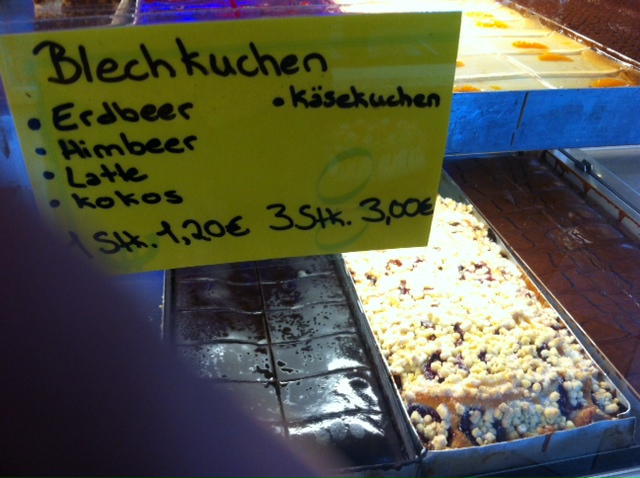 Geschlagen schlurfe ich die laute Müllerstraße zurück. Noch ein verzagter Blick an den Ort, wo bis vor kurzem eine Ableger einer Steglitzer Konditorei Erlesenes anbot. Ist jetzt türkisch und stellt feiste Sahnetorten aus, von allem ein bisschen zu viel. Doch bevor ich mich schwermütig in den nächsten U-Bahn-Schacht stürze, erscheint mir „Thobens Backwaren“. Ein billiger Berliner Kettenbäcker. Seine Filiale habe ich bisher immer hochmütig übersehen. Wer Schrippen für 9 Cent anbietet, kann doch nichts Ordentliches haben. Nichts Ordentliches? Ein Blech voll frischem Pflaumenkuchen, der in seiner Größe meiner Oma selig zur Ehre gereicht hätte. Na gut, er ist nicht ganz so saftig, aber er kostet ja auch nur 89 Cent das Stück. Ich nehm gleich zwei, und dick süße Sahne dazu. Und bevor der Sohn im Wagen aufwacht, bestell ich noch ein drittes.