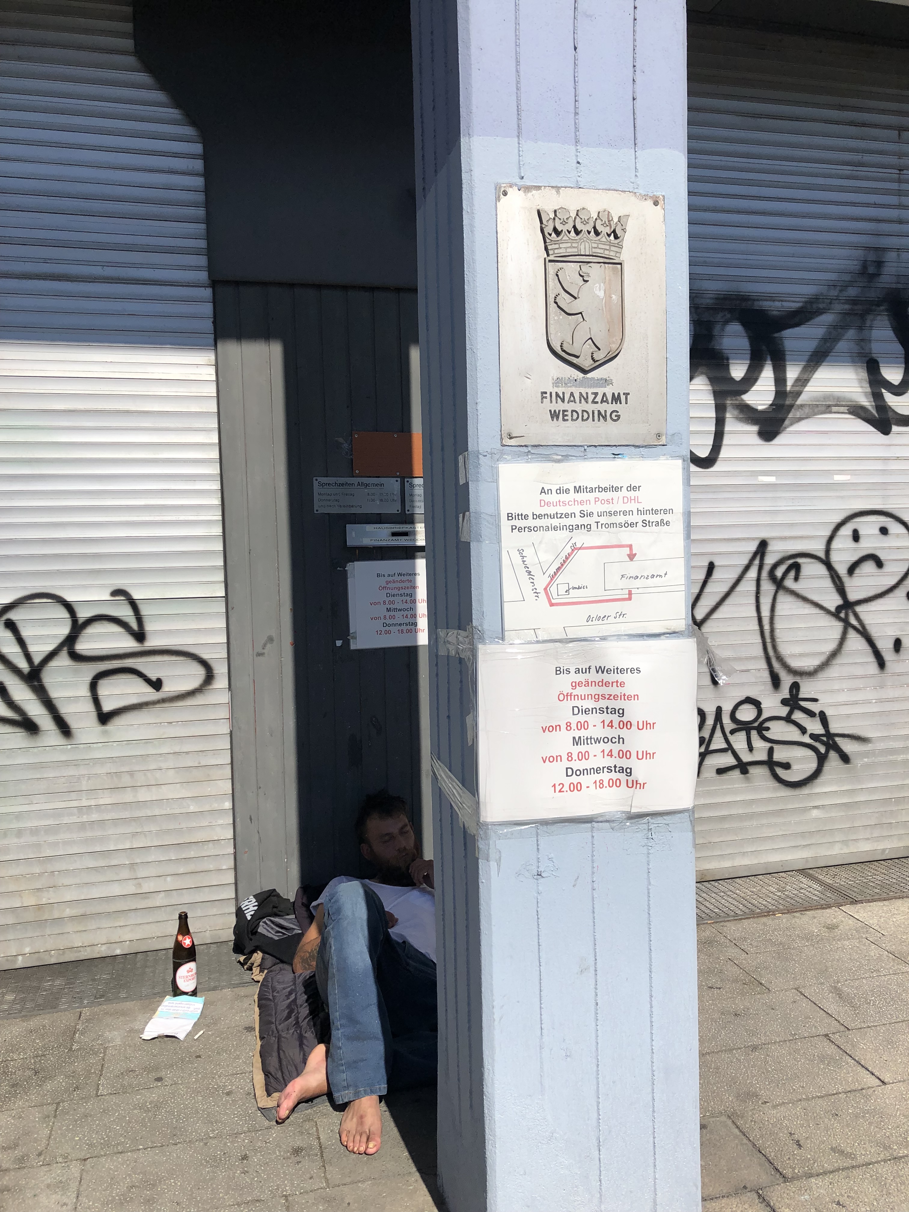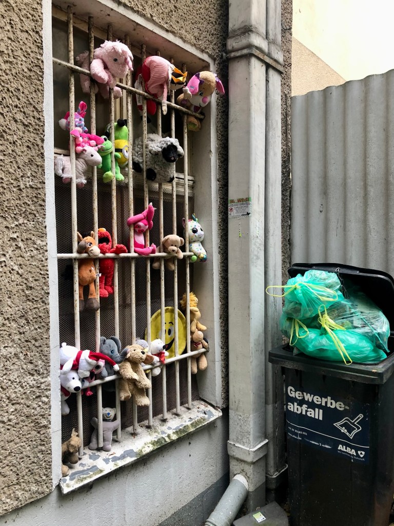 Die schmale Haustür steht offen und gibt den Blick frei in einen schattigen Hinterhof mit etwas Grün. Grün im grauen Wedding? Neugier zieht mich in den dunklen Flur. Ein altes Schild „Kinderwagen und Fährräder abstellen strengstens untersagt!“ Ein neues Schild einer neuen Hausverwaltung aus Halle, die das füttern von Tieren im Hof verbietet, weil das „Ungeziefer“ anlocke. Der Hof war mal groß, jetzt wird er zum Nachbarhaus durch eine graue Wellblechwand getrennt, an der überfüllte Mülltonnen stehen. Die gefiederten hellgrünen Blätter von zwei wild gewachsenen Ebereschen machen das Grau der grob verputzen Hauswände nur noch dunkler. In den vergitterten Fenstern im Parterre des Vorderhauses sind schmuddelige Kuscheltiere eingeklemmt. Als ich ein Foto davon mache, steht plötzlich ein Mann neben mir. 1,90 groß, breite Schultern, schwarze Basecap, irgendwas in Frakturschrift auf seine schwarze Hose gedruckt. Security? Hausmeister? Nazi? Ich versuch‘s mit Dreistigkeit. „Wissen Sie, wieso die Kuscheltiere dort hängen?“ Die Antwort verstehe ich nicht gleich. Er sucht die richtige Reihenfolge für die deutschen Worte. „Wasserpfeifen“, verstehe ich und „Dampf“ und ich reime mir zusammen, dass er die Shisha-Bar im Vorderhaus meint. „Weil die immer Dampf in den Hof blasen, und das so freundlicher ist, für die Nachbarn“, verstehe ich. Und, er deutet auf die Mülltonnen: „Weil man dann was Schönes sieht und nicht den Dreck.“ „Wenn du Kinder hast: Nimm mit.“, läd er mich ein. „Drei Söhne“, fange ich an zu plaudern. „Aber die sind aus dem Alter raus.“ „Ich hab auch einen Sohn, 25, aber nicht ganz gesund. Lebt nicht bei mir.“ Trauriges Thema. Er kommt von selbst auf was anderes. Erzählt, dass er schon lange hier lebe und, dass die Hausverwaltung gewechselt habe. „Kein Hausmeister. Immer wenn du was willst, musst du ein Formular schreiben.“ Aus dem Treppenhaus des Hinterhauses kommt ein Mann mit einer Werkzeugtasche und läuft geschäftig an uns vorbei. Ein Handwerker, und das an einem Samstagmorgen. „Kein Hausmeister?“, runzle ich die Stirn. „Und was ist das?“ „Das ist für die neuen Häuser.“, sagt er. Ich suche mit den Augen einen Neubau, bis ich verstehe, dass die Handwerker leerstehende Wohnungen im Haus renovieren, die teuer neu vermietet werden. „Beim Nachbarn ist der Boiler kaputt. Seit drei Monaten. Da kommt niemand.“ Wir reden weiter über Politik, über Gaza und die kaputten Schulen und die Jobcenter. Da ist er Kunde. „Wird jetzt schwieriger, wegen der Regierung.“ Zwei Jahre habe er noch. Er sei 65, selber nicht mehr ganz gesund. Gutachten, Ärzte, Formulare. Er hoffe, dass er bald die Rente bekomme. „Ich hab auch noch zwei Jahre“. „Wenn die Regierung uns nicht noch länger warten lässt.“, flachst er ironisch zurück. Wir wünschen uns Glück, Gesundheit und ein gutes Wochenende.