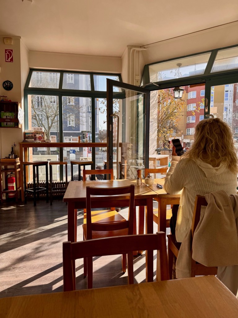Die selbstbewussten Frauen, die das Café Freysinn hier seit Jahren schmeißen haben mir die Wahl zwischen fünf vegetarischen Gerichten gelassen und als ich danach noch sehnsüchtig auf den Mohnkuchen in der Vitrine schmulte (das ist mein Lieblings-Alt-Berliner Wort und bedeutet „verstohlen neugierig schauen“), kriegte ich das Reststück für n‘ nen Euro. So schön kann Berlin sein. Das geht doch nicht mit rechten Dingen zu.